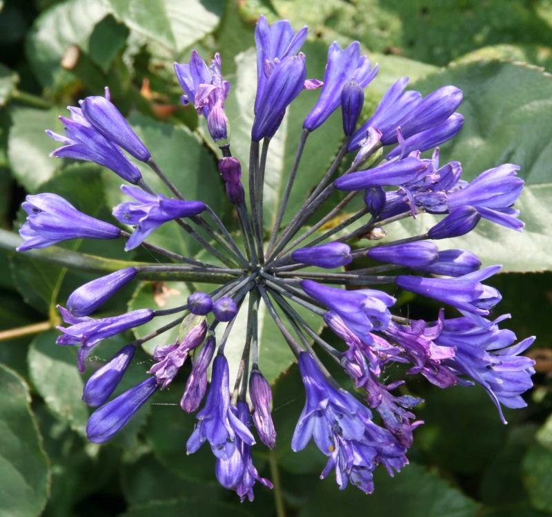 Agapanthus Donau зацветает в конце весны и цветет до середины лета. Цветки голубые с темно-синими полосами и фиолетовыми оттенками. Цветоножки темно-фиолетовые. Соцветия округлые. Стебли прямостоячие. Листья глянцевые, темно-зеленые. Сорт происходит из Африки.