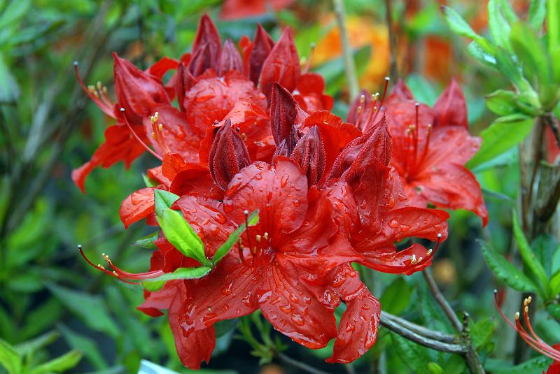 Азалия (рододендрон листопадный) Parkfeuer - быстрорастущий кустарник с прямым силуэтом. Цветы красные, блестящие, внутри оранжевые, с тычинками белого цвета, с лёгким запахом. Очень привлекательный новый сорт. К 10-ти годам вырастает до 2 м.