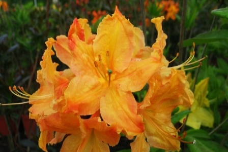 Азалия Sunte Nectarine - пряморастущий листопадный кустарник. Очень быстрорастущий сорт. Достигает 180 см высоты и 120 см ширины. Листья зеленые эллиптические длиной 5-10 см, осенью красно-оранжевые. Цветки крупные 8-9 см диаметром, широко раскрытые золотисто-желтые с оранжевым оттенком и огненной окраской с наружной стороны лепестков. Сорт очень декоративен, с самым сочным оттенком среди известных рододендронов.