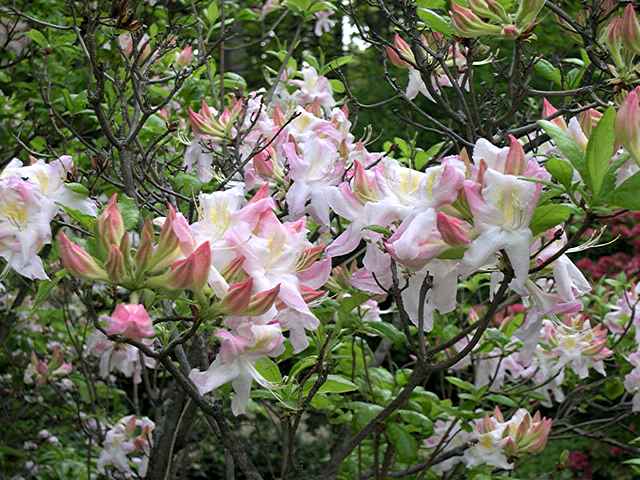 Азалия, Рододендрон желтый Сильфидес - сорт листопадных рододендронов гибридного происхождения. В возрасте 10 лет высота около 1,5-2,0 м Крона округлая. Листья блестящие, молодые красно-коричневые, позже зелёные. Соцветия несут 8—14 цветков. Цветки воронкообразные, бело-пурпурно-розовые с ярким жёлтым пятном. Цветки с ароматом средней интенсивности. Цветение в мае—июне.