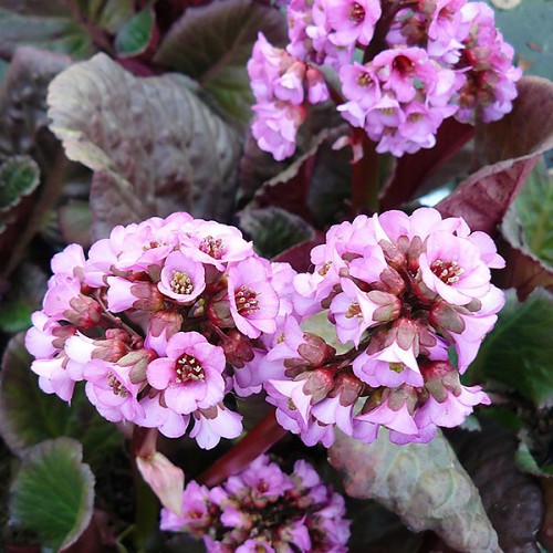 Бадан гибридный Мэджик Джайнт - цветки большие, ярко-розовые. Листья огромные, нижние - тёмно-зелёные, верхние – фиолетово-красные. Стебли красные.