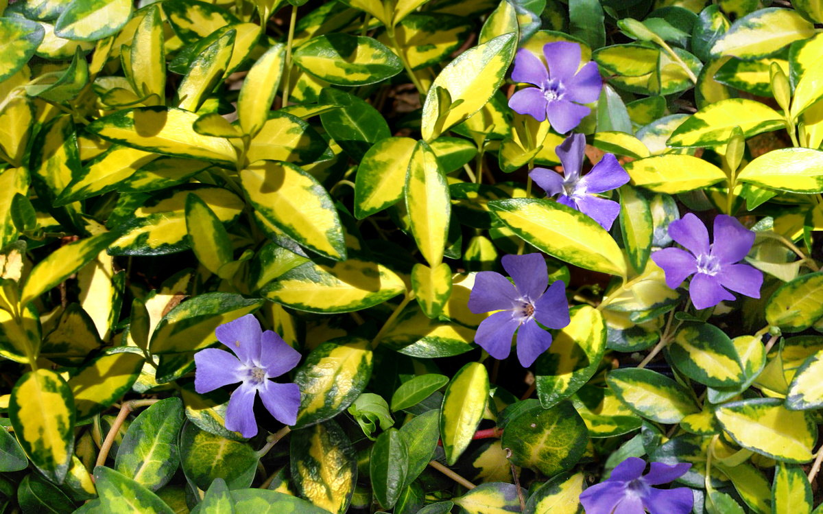 Барвинок малый ‘Aureovariegata’ имеет привлекательные листья с золотистыми и желтыми пестринками и красивые лавандово-голубые цветки. Вечнозеленое почвопокровное растение. Оно вырастает в высоту до 15–30 см, а в ширину – до 100–150 см. Оно, быстро распространяясь, способно подавлять рост сорняков.