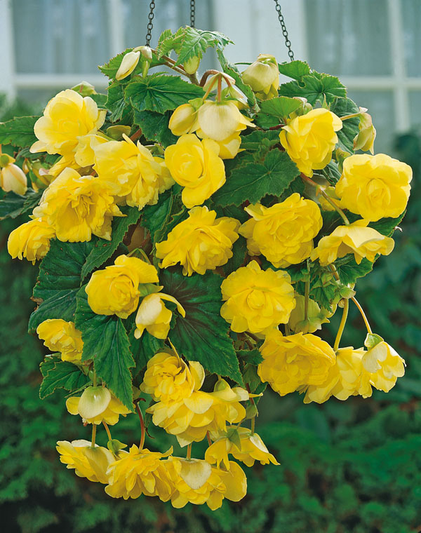 Изящные стебли этой ампельной бегонии с каскадом махровых цветков и многочисленными новыми желтыми бутонами все лето и осень великолепно смотрятся в настенных кашпо, подвесных корзинах, горшках на цветочных подставках и полках. Размер цветков 6-8 см. Семена или гранулы высевают с декабря по март, поверхностно, во влажный субстрат. Прорастание на 7-14 день при оптимальной температуре 23...25 С. Через 6 недель пикировка и первая подкормка азотным удобрением. Спустя 11 недель пересадка: одиночные растения - в горшки диаметром 10 см, по 3-5 растений - в горшки диаметром 25, по 3-5 растений - в корзины диаметром 30 см. Выращивание при температуре 20 С. С момента прорастания и до середины марта растениям необходимо обеспечить 14-часовой световой день. Рекомендуется еженедельная подкормка азотными удобрениями для лучшего развития корневой системы. Молодые растения необходимо притененять от прямых солнечных лучей. Короткий день и температура ниже +16 С способствуют клубнеобразованию, но задерживают начало цветения.