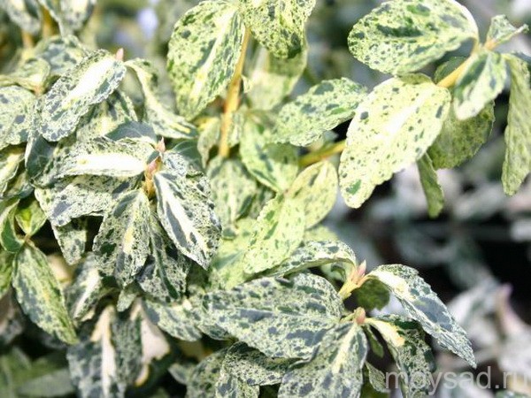 Саженцы Бересклета Форчуна Golden Harlequin относятся к вечнозеленым растениям и прекрасно подойдут для украшения сада. Растение с очень декоративно окрашенными плотными листочками хорошо смотрится около домов и в центре клумб.Зеленые листья с желтоватыми мазками будут всегда выделяться на фоне остальных растений. Сорт почвопокровный и во время цветения показывает голубые цветы. После цветения плоды красиво смотрятся среди листвы. Почва под кустарник требуется не очень плотная, с богатым составом полезных веществ. От качества земли зависит цветовая гамма листвы крупномера Golden Harlequin. Зимой сорт может вымерзать, поэтому требуется укрытие.