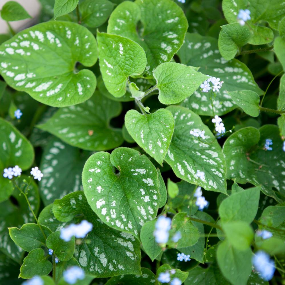 Бруннера крупнолистная сорта Langtrees – многолетнее цветущее растение. Этот сорт характеризуется крупными листьями темно-зеленого цвета с серебристыми крапинками по всей поверхности листа.Цветы этого невысокого травянистого кустарника (35-45 см в высоту) приятного голубого цвета с белой сердцевиной. Зацветает в конце апреля и месяц радует прекрасными цветами.Хорошо цветет не только на солнечных участках, но и в затененных уголках сада или парка. Прекрасно переносит зимние холода, сильных морозов не боится. На одном месте без пересадки может прекрасно цвести и развиваться в течение 15 лет.В народе называется незабудочником, поскольку его цветы по форме очень напоминают незабудки. Однако, в отличие от них, цветы бруннеры значительно крупнее и не источают аромата.Любит умеренно увлажненную почву.