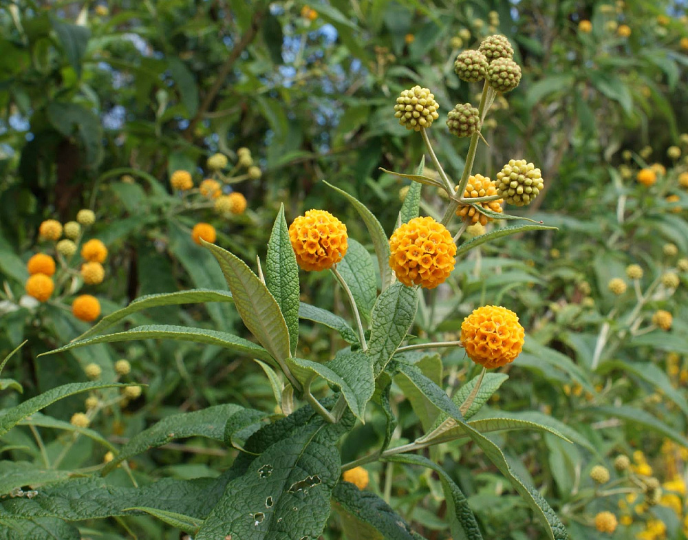 Быстрорастущий кустарник свободной формы, вырастает высоты 2 м. Побеги слегка дуговидные. Листья зеленые, узкие. Цветки желто-оранжевые, собраны в достаточно короткие (20 см дл.) соцветия, цветут с июня по октябрь. Хорошо растет в теплом, защищенном, солнечном месте с плодородной, достаточно влажной почвой. Кустарник нуждается в укрытии на зиму и обрезке весной