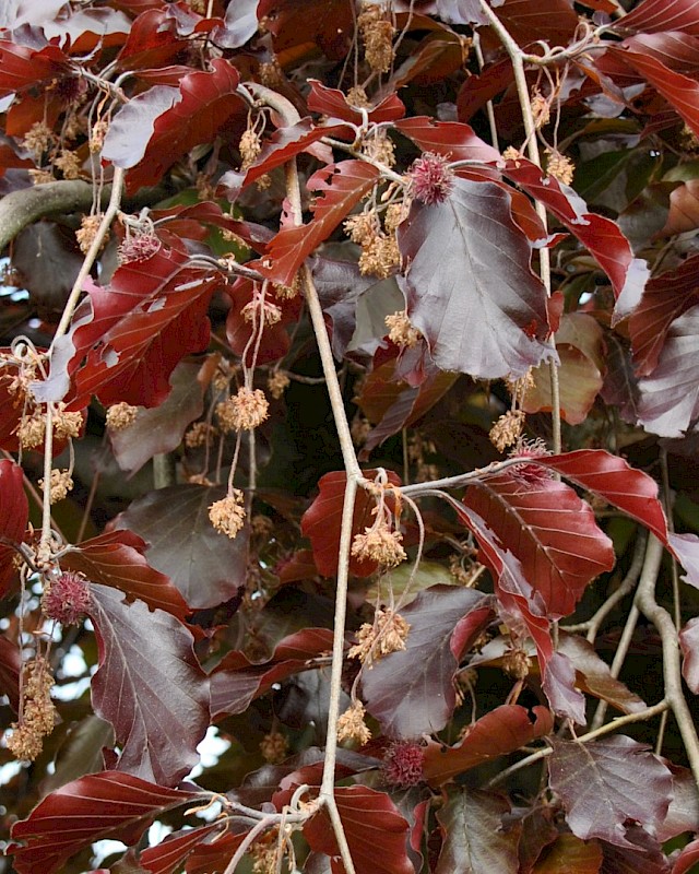 Бук лесной Purple Fountain является крупным сортом краснолистного привитого листопадного дерева с вертикальной узкой кроной, плакучими ветвями и фиолетовыми листьями. Верхушка характерна – повислая. Purple Fountain пользуется высокой популярностью, так как имеет плотную крону колоновидной формы, которая не создает тень для соседних насаждений. К двадцати годам дерево достигает ширины до 2 метров и высоты до 5 метров. Листья темно-красные, осенью становятся желтыми. Как и иные краснолистные буки, любит обилие солнечного света, одновременно устойчив к тени и полутени, относится к теплолюбивым. Особых требований к почве нет, однако предпочтительными являются глинистые, плодородные, влажные почвы с достаточным уровнем извести. Саженцы достаточно прихотливы при пересадке.