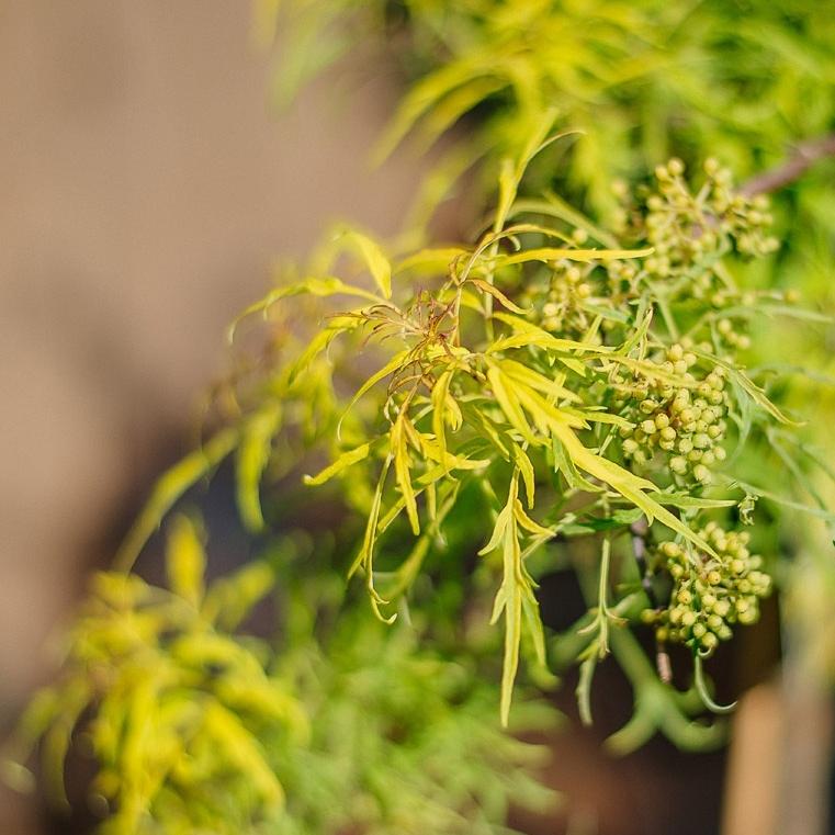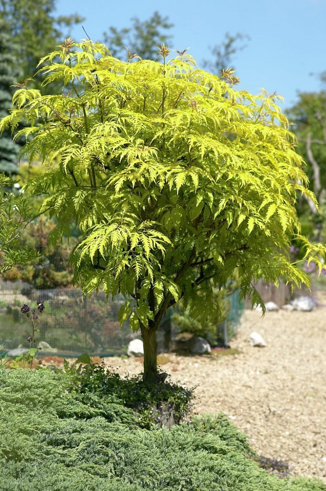 Густой кустарник высотой до 0,8 м (высота растения зависит от высоты штамба). Крона густая, шаровидная. Листочки продолговато яйцевидные или продолговато-овальные, длинно заостренные, золотисто желтые, глубоко рассеченные. Окраска наиболее яркая при распускании, на солнечных участках сохраняется очень долго, в тени бледнеет. Цветки очень мелкие, желтовато-белые, в очень плотных метелках. Плоды шаровидные, темно- красные. Предпочитает плодородные, влажные, хорошо проницаемые почвы.Цветет в мае-июне мелкими зеленовато-зелеными цветочками,которые собраны в прямостоящие метки,высотой до 6 см. Бузина цветет без запаха. Образует ярко-красные плоды, которые являются ее достоинством. Бузина достаточно теневынослива, но в тоже время хорошо растет на открытом, солнечном месте. Нуждается в защите от северных ветров. При недостаточной влаге сильно поражается тлей. Очень выгодно использовать ее для закрепления берегов водоема. Зимостойка. Используется в одиночно и групповой посадке