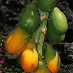 Carica papaya Waimanolo цветет и плодоносит на второй год. Цветы мясистые, 5-лепестковые, восковые, обладают легким приятным ароматом. Плоды грушевидной формы. Мякоть ярко-розовая со множеством мелких черных семян.