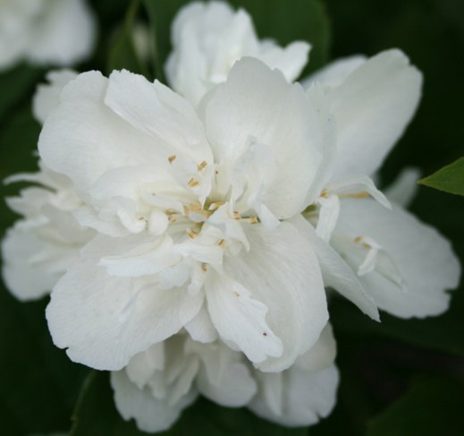 Чубушник Zoya Kosmodemyanskay - куст, высотой 1,2 м, широкий, густо-облиственный, шаровидной формы. Цветки крупные, диаметром около 7 см, махровые, собраны в соцветия (7-9 шт), с тонким ароматом.