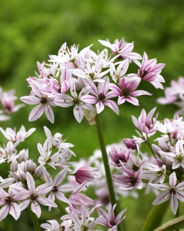 Аллиум (декоративный лук) «Хамелеон» радует оригинальными соцветиями шаровидной формы. Цветочки культуры окрашены в кремово-розовый оттенок, а лепестки украшены темно-розовой линией по центру. Сердцевинки цветков светло-зеленые, а тычинки – насыщенно-желтые