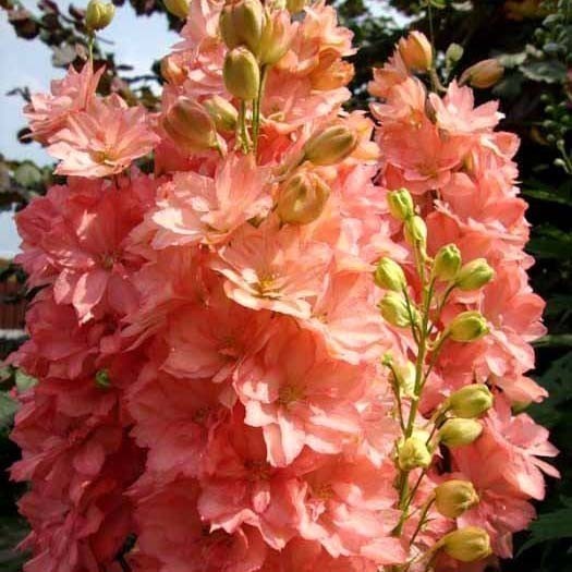 Дельфиниум культурный Корал Сансет: Яркий и статный красавец! Плотные соцветия из полумахровых остроконечных цветков. В начале цветения цветки кораллово-розовые. Постепенно в окраске проявляется насыщенный оранжевый цвет, придавая цветкам к концу цветения огненный цвет заходящего солнца. Компактный, отлично подходит для серьезного ряда цветника. Не подвержен заболеваниям.