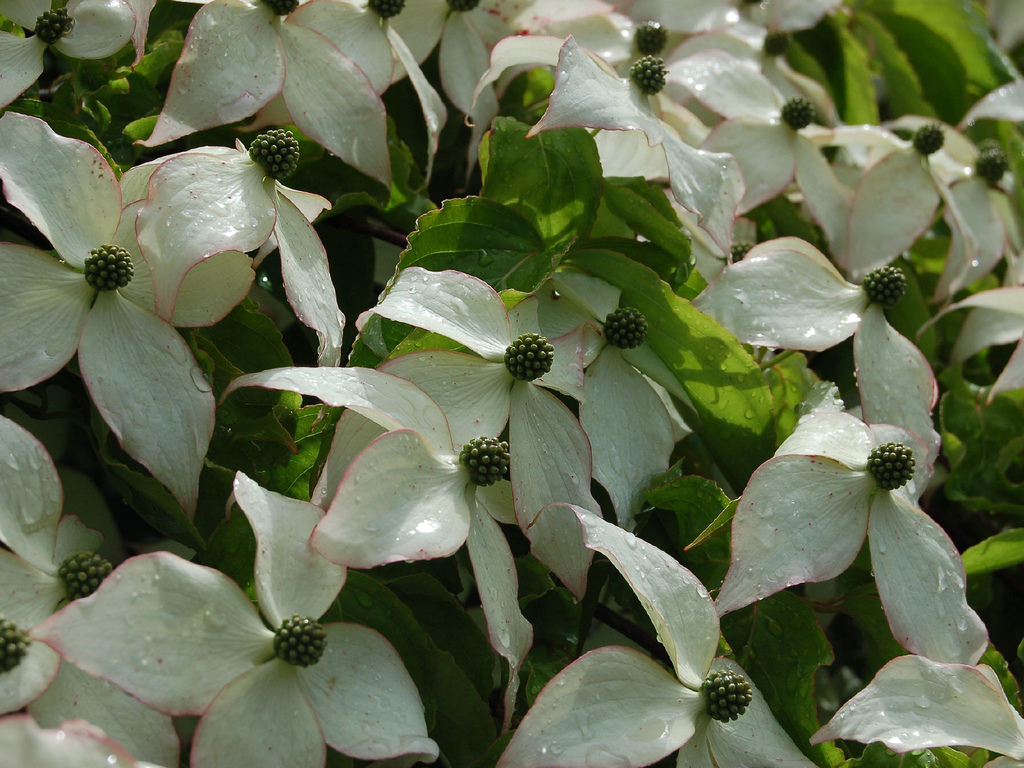 Цветение: Зелено-жёлтые цветки диаметром до 10 см, расположенные на 4 белых прицветниках, цветет с конца мая до июня. Прицветники очень красивые, выглядят очень изящно и грациозно. Зацветает спустя 2-3 недели после дерена цветущего. Плоды: Похожи на малину, тёмно-розовые, диаметром около 2 см, на черенке длиной 4 - 6 см, очень декоративные.