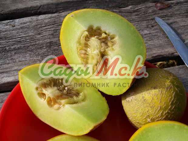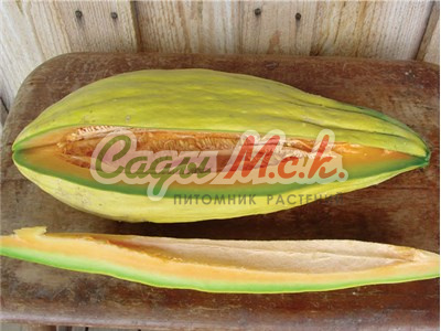 Среднеспелый (69-90 дней от всходов до плодоношения) сорт. Растение плетистое, главная плеть средней длины. Предназначен для выращивания в пленочных теплицах. Посев на рассаду в конце апреля. Высадка рассады в конце мая – начале июня в возрасте 30-35 дней. В южных регионах выращивают в открытом грунте прямым посевом в апреле-мае. Схема посадки 70х150 см. Растения подвязывают к шпалере, до высоты 50 см удаляют все боковые побеги, последующие прищипывают над 1-3 листом. Полив умеренный, особенно в период плодоношения. На растении образуется 2-3 плода. Плод округлый, гладкий, с нежной сеткой (встречаются плоды с элементами сетки и без нее), массой 1,2-1,8 кг. Фон апельсиново-желтый с рисунком в виде узких, прерывистых, оранжевых полос, скрывающихся под основным фоном. Кора средней толщины, гнущаяся, прочная, на разрезе кремовая. Мякоть кремовая, толстая, хрустящая и зернистая, сочная, очень сладкая с дынным ароматом. Семенное гнездо маленькое.