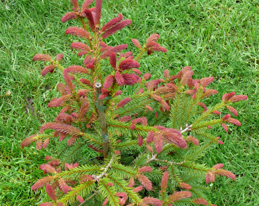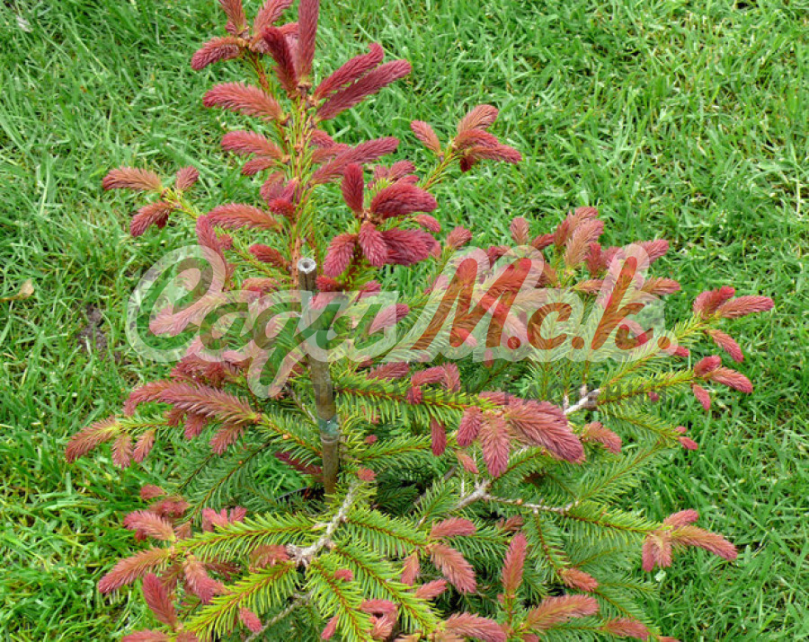 Интересный сорт для любителей экзотики. Молодые побеги этого сорта имеют эффектный красный окрас, затем буреют и становятся темно-зелеными. Годовые приросты по 15-20 см, к десяти годам растение достигает 150 см и 100 см в диаметре. Ель светолюбива, переносит легкую затемненность.