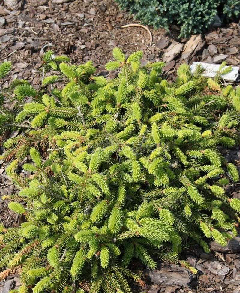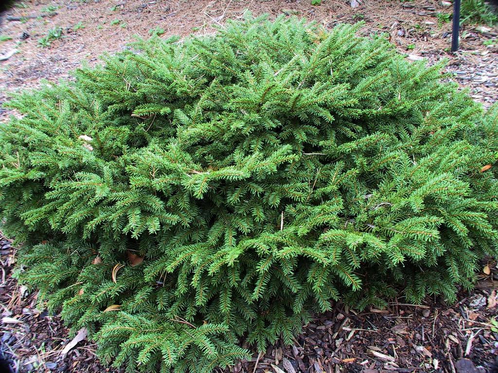 Ель обыкновенная Procumbens - карликовый кустарник до 0,5 м высотой и 2-3 м шириной. Крона плоская, широкая. Ежегодный прирост в высоту 3-4 см, в ширину 10 см. Хвоя густая, очень жесткая на ощупь, ярко-зеленая, 10 - 17 мм длиной (самая длинная среди всех плоскорастущих форм). Теневынослива, но лучше развивается при достаточном освещении. Требования к почве и влаге невысоки. Переносит временное избыточное увлажнение. Морозостойка. Отлично подойдет для одиночных посадок в небольших садах, альпийских горках, альпинариях.