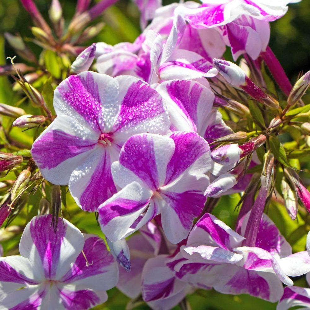 Флокс метельчатый Кенди Твист - многолетний, травянистый сорт. Высота куста 60 сантиметров. Период цветения июль-сентябрь. Период посадки весной или ранней осенью, лучшие сроки весенней посадки — первая половина мая, а осенней — третья декада августа — первая декада сентября. Цветки душистые, белые с сиреневой полосой по центру лепестка. Для посадки Флокса метельчатого Кенди Твист выбирают слегка притенённые места, с влажной почвой, богатой питательными веществами и удобренной навозом. Флоксам необходимы подкормки, рыхления и обильный полив (почва должна быть всегда влажной, но не переувлажнённой).