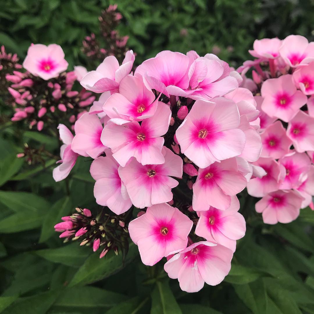 Флокс метельчатый Милена - светлые бело-розовые цветки с насыщенной малиновой серединкой, около 4 см в диаметре. Куст невысокий, 55-65 см, и довольно раскидистый, его стебли прочные, не поникают под тяжестью соцветий. Цветет все лето, с июня до конца августа.