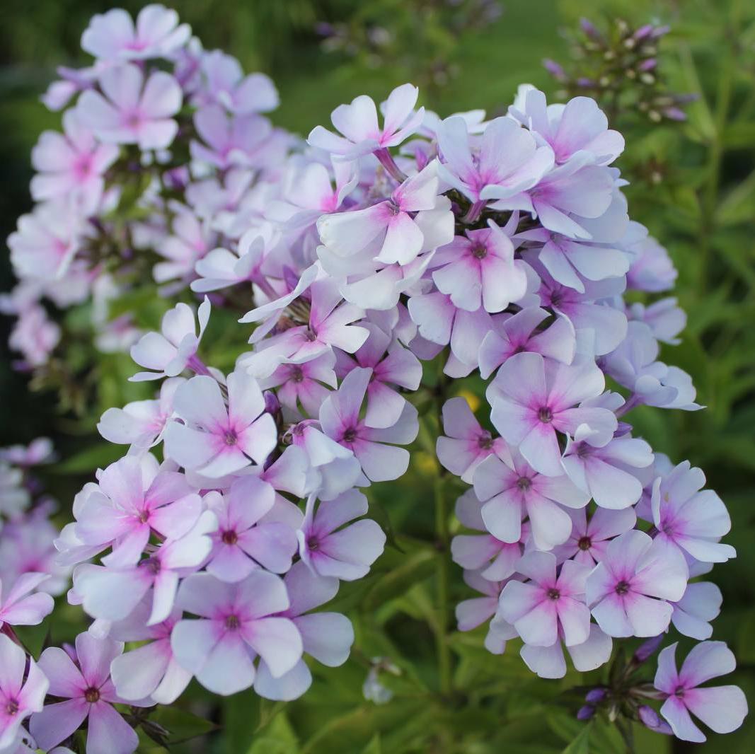 Флокс метельчатый Сильфида - пышные соцветия, состоящие из множества ажурных цветков с волнистыми лепестками. В мифологии сильфида – грациозная воздушная красавица, воплощение легкости и изящества, именно такое впечатление производят белые цветки, диаметром 3,5 см, с сиренево-фиолетовыми тенями и пурпурным центром. Высота Флокса метельчатого Сильфида достигает 95-105 см.