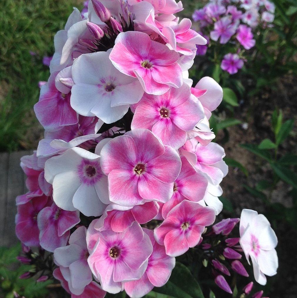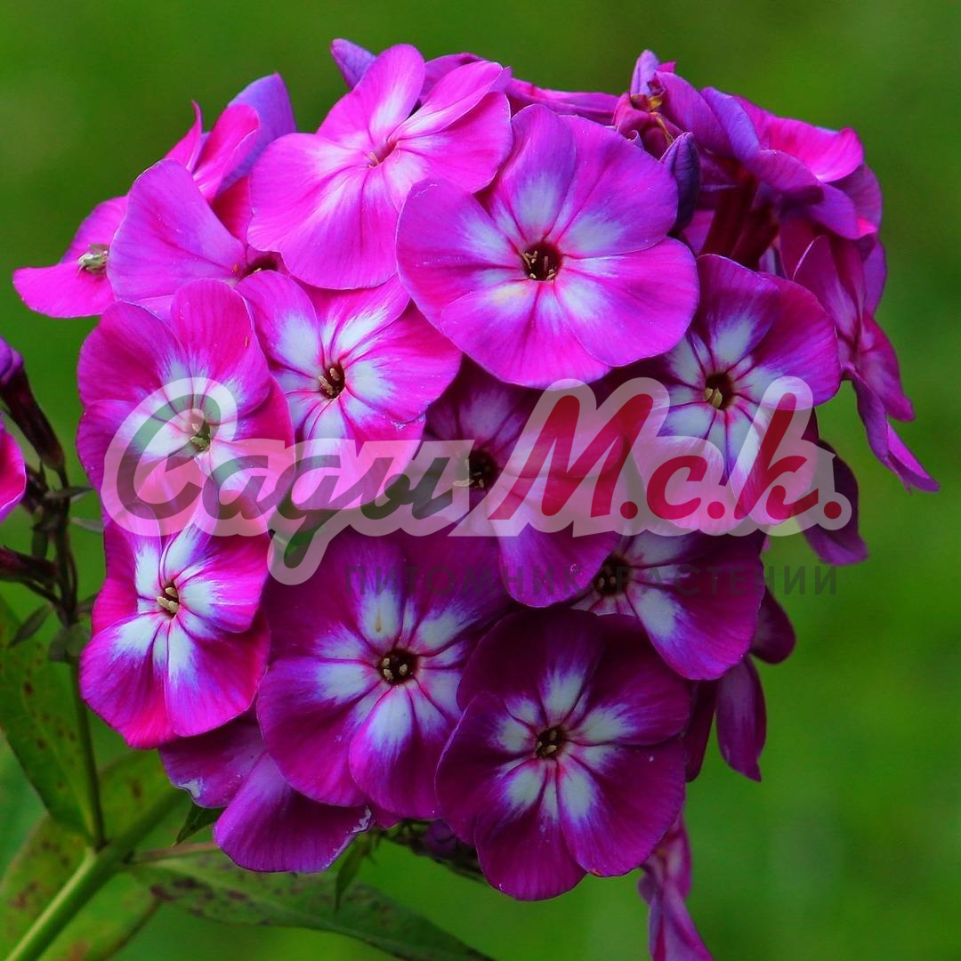 Флокс метельчатый Татьяна имеет белые цветки с розовым напылением и пурпурным центром. Высота растения 75-85 см, диаметр цветка- 4,2 см. Очень продолжительный период цветения.
