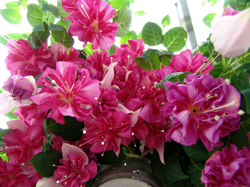 Фуксия Bella Rosella - полу-ампельная. Чашелистики белые, чуть розоватые, с изнанки розовые. Лепестки распускаются ярко-сереневые с пурпурными прожилками, затем становятся пронзительно пурпурные. Цветы огромные, густо махровые, очень долго держатся. Сорту характерно длительное и обильное цветение.