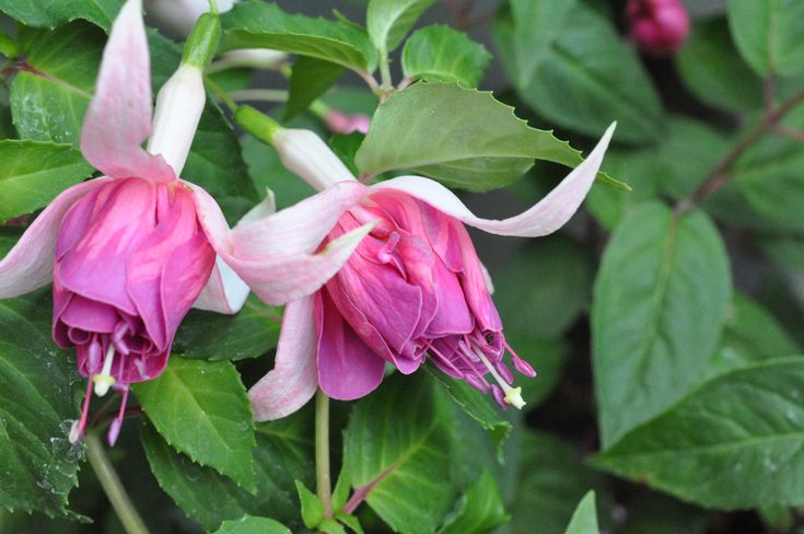 Фуксия Коэн Баккер/Coen Bakker - ампельная форма. Бутоны продолговатые. Чашелистики белые с зелеными кончиками, поднятыми вверх. Юбочка пурпурная с яркими розовыми мазками. Цветки махровые, очень крупные. Листья средне-зеленые. Обильно и длительно цветущий сорт.