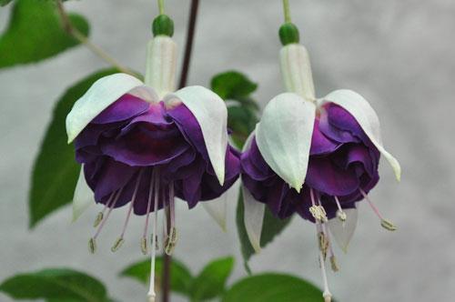 Фуксия Пинто де блю — полуампельная форма фуксии. Бутоны продолговатые, чашелистики белые с легким светло-розовым напылением. Юбочка необычного синего цвета. Цветки густомахровые, очень крупные. Средне-зеленые листья. Обильное цветение.