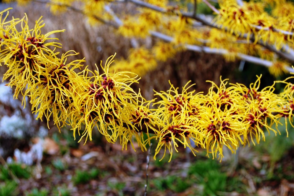 Гамамелис (волшебный орех) Arnold Promise - этот вид кустарника при благоприятных климатических условиях может достигать в высоту до 45 м. Цвести начинает в марте и заканчивается в апреле. Во время цветения обильно покрывается желтыми цветами. Яркие и крупные цветки очень эффектно выглядят на фоне темных веток кроны. Узкие и длинные темно-зеленые листья к осени становятся ярко-оранжевыми и при наступлении холодов сворачиваются. Растение теплолюбиво и плохо переносит зимнюю стужу, зацветает во время оттепели. С наступлением заморозков необходимо укрытие от холода. Сразу после посадки растет очень медленно, но в садовых почвах быстро набирает силу.