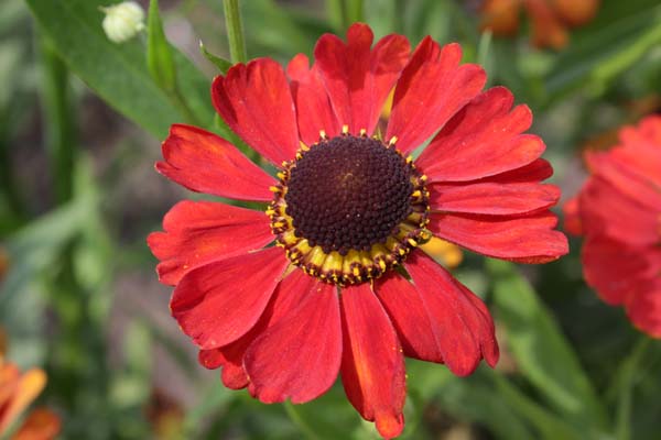 Гелениум Меранти: Цветки кирпично-красные с большим центральным диском. На молодом растении диск отчётливо полосатый с лучистым коричневым узором. Листья ланцетные, длиной 14 см и шириной 2,5 см.
