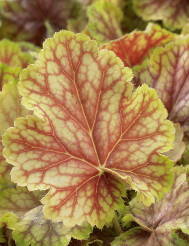 Гейхера MASTER PAINTERS - компактный куст высотой около 30 см. Листья слегка выпуклые, зелёные с пурпурно-лиловыми прожилками. По мере роста листва краснеет и приобретает чётко выраженную зелёную кайму. Цветки розово-красные.