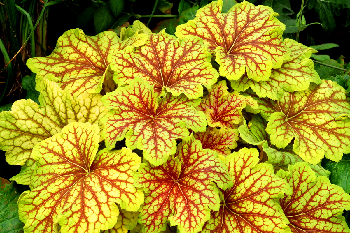Гейхера Red Lighting - новинка 2015 года. Высота листвы – 25 см, высота цветоносов – 45 см, диаметр куста – 40 см. Листья большие, округлой формы, слегка разрезанные, яркого золотисто-желтого оттенка с темно-красными прожилками с центра. Сохраняет цвет весь сезон. Цветки белые. Сорт зимостойкий.