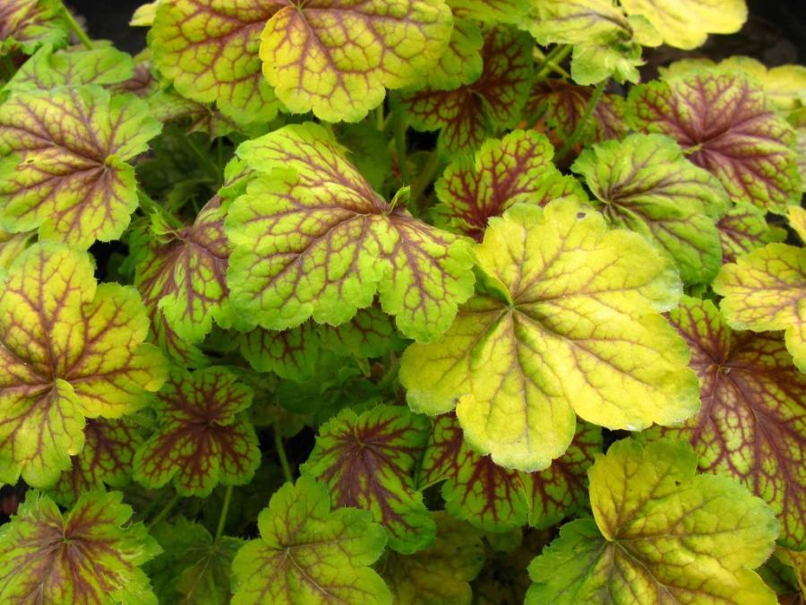 Гейхера Renoir контрастная, обращающая на себя внимание. Высота растения около 30 см, диаметр куста до 60 см. Листва великолепная, изменяющая окраску от светло-зелено-желтой весной до ярко-желтой с пурпурными прожилками летом.