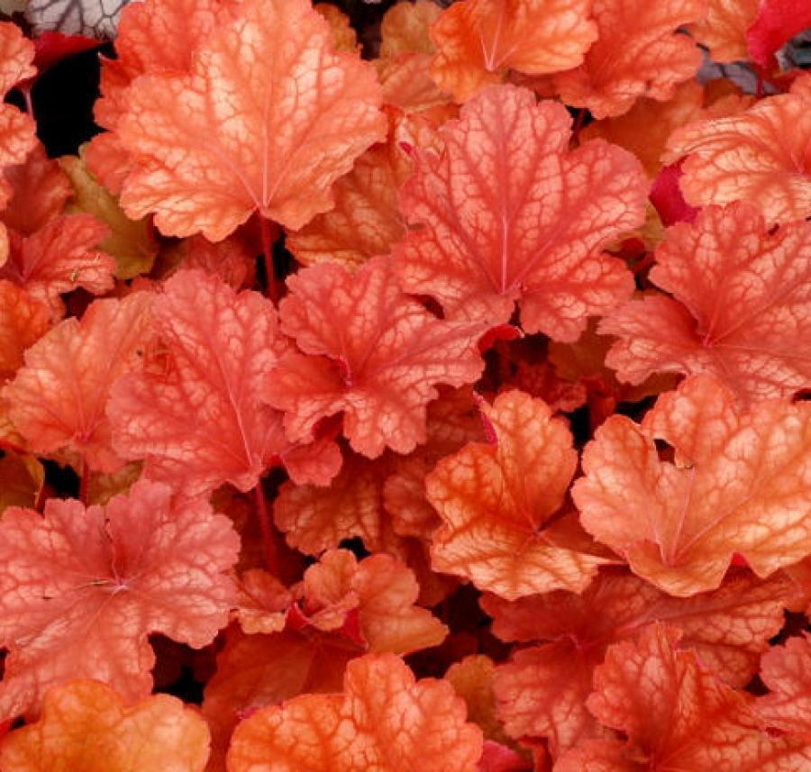 Гейхера RIO - очень яркий, нарядный новый сорт гейхеры. Листья меняют цвет в течение сезона от зеленовато-оранжевого до янтарно-красного. Цветки белые, цветение обильное и продолжительное, с мая по сентябрь. Высота куста 25 см, ширина 35 см.