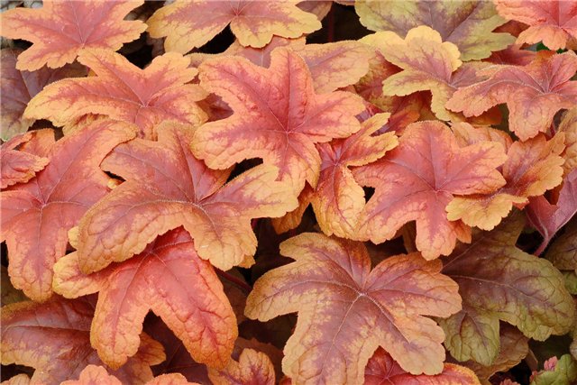 Гейхера Sweet Tea - очень нарядная крупная гейхера, которая постоянно изменяет окраску своих резных листьев от ярких до пастельных тонов. Листья разрезанные, кленовидной формы, образуют кустик 45 см высотой и диаметром 65 см. Листья интенсивной окраски, насыщенно-оранжевые, цвета спелого апельсина, с ярким, коричнево-вишневым пятном вокруг жилок. Летом окраска чуть бледнее, к осени становится ярче и интенсивнее. Цветки белые, собраны в изящные соцветия. Цветение в июне-июле.