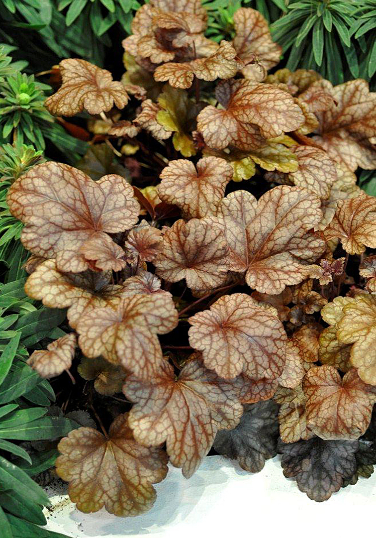 Гейхера VAN GOGH компактная, с великолепной резной листвой красного цвета с зеленой каймой. Вены (прожилки) пурпурно-лиловые. Весной листья зеленые, лаймовых тонов, а к осени полностью краснеют. Цветы розово-красные, появляются в мае-июне. Высота растения - 30-40 см. Сорт предпочитает солнце и полутень.