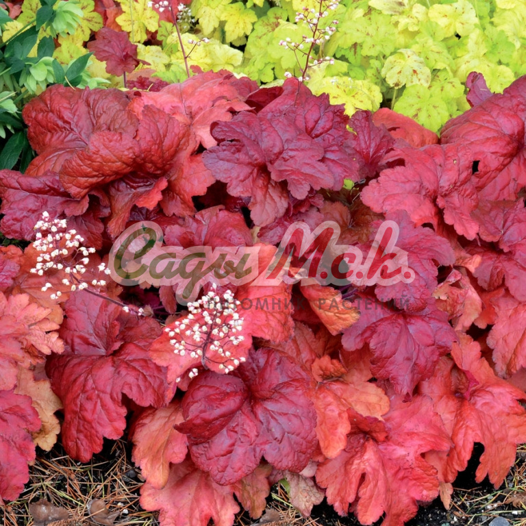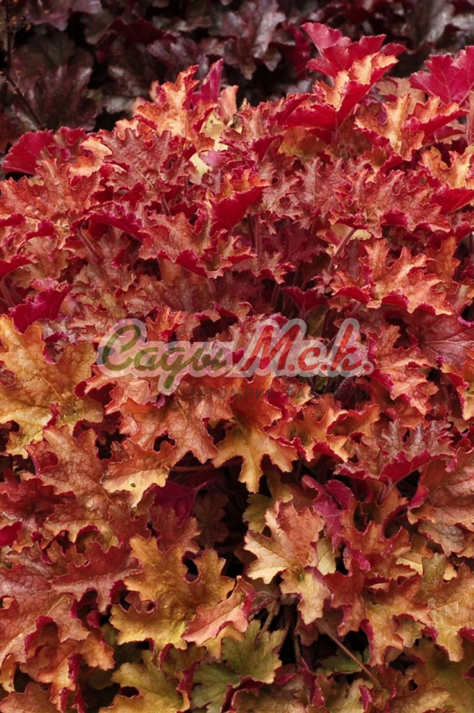 Гейхера аutumn Lеаvеs – невысокое почвопокровное растение, образующее кустики в высоту до 20 см и в ширину до 40 см. Предпочитает открытые участки, выбирая место в полутени или тени. За постоянное изменение цвета сорт называют растением-хамелеоном. За сезон оно четырежды изменяет цвет своей листвы: постоянно зеленые листья весной становятся красными, летом – темно-серыми с рубиново-красными пятнами, осенью – красно-бордовые. Поэтому кустики постоянно остаются декоративными. В июне растение зацветает, и пора цветения продолжается до августа. Мелкие кремовые цветочки собраны в рыхлые метелки. Почвопокровник не требователен в уходе и может расти на одном месте несколько лет.