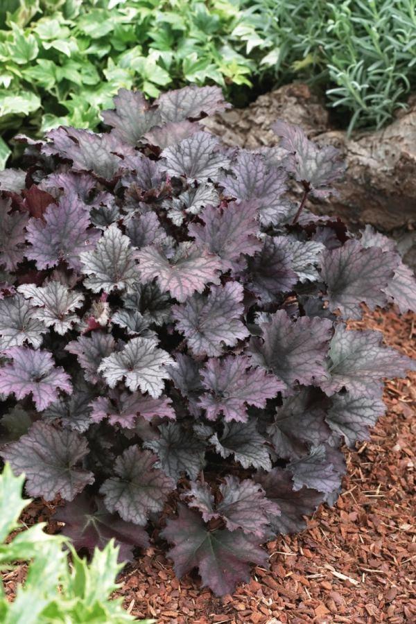 Гейхера Frоstеd Viоlеt – крупный многолетник с большими слегка опушенными листами. Гибридное растение имеет роскошный, необычный для растений цвет – матовый, насыщенно-фиолетовый с серебряными бликами и разводами. К концу сезона молодые фиолетово-розовые листья с более темными прожилками приобретают сливово-пурпурные оттенки. С июня по июль кустик цветет светло-кремовыми цветочками, собранными в рыхлые соцветия, которые особенно привлекательно смотрятся на темном фоне листовых розеток. Этот гибридный сорт любит плодородные почвы с хорошим дренажем и полутеннистые места. Именно в таких условиях он покажет себя во всей красе.