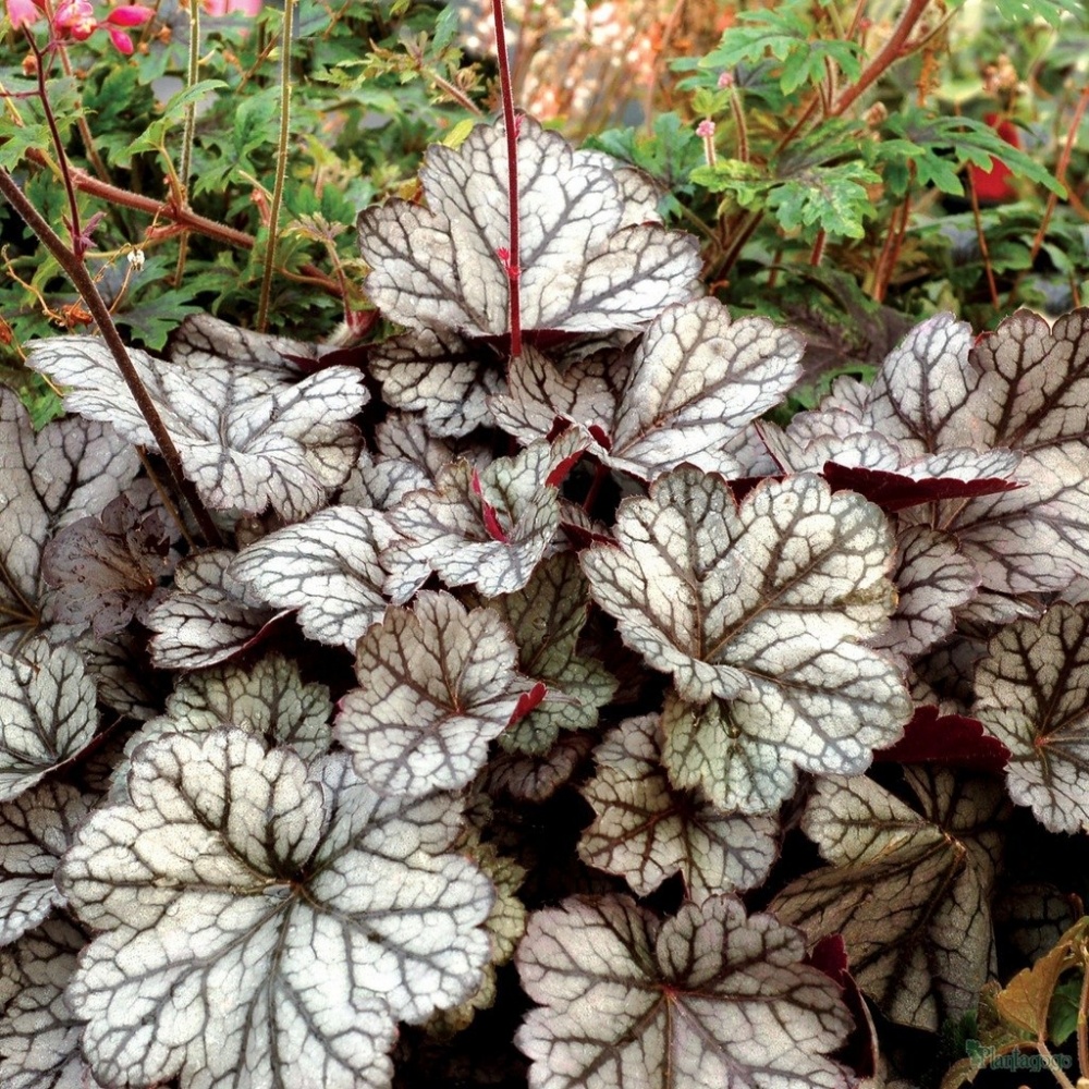 Гейхера гибридная Глиттер (Glitter) обладает необычной расцветкой, которая внесет яркий акцент в смешанные посадки. Серебристая с красными прожилками листва многолетника отлично смотрится с представителями других декоративных культур. Этот сорт применяется для украшения миксбордеров, альпийских город и искусственных водоемов.