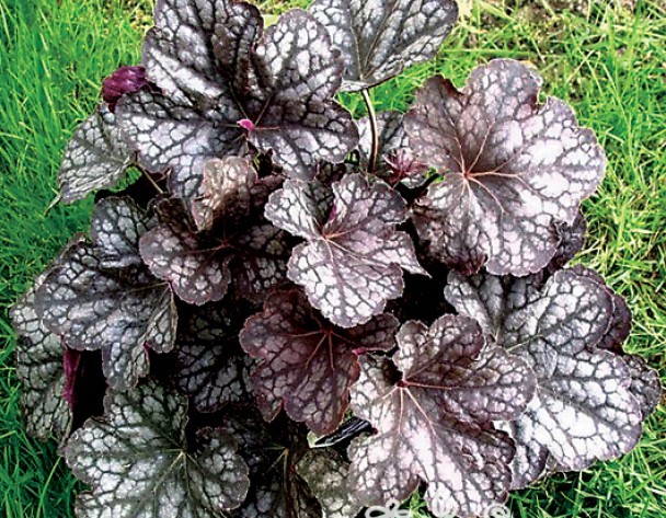 Гейхера Velvet Night – многолетнее гибридное растение, на которое обязательно обратишь внимание. У нее невероятно эффектные, крупные, бархатистые темные листья самых разных оттенков. Сорт превзошел все ожидания: кустик, действительно, завораживает. Матово-бархатная листва украшена контрастными прожилками. Можно встретить пурпурно-лиловые тона с пепельными пятнами между жилками или сливовые листьевые пластинки с оловянно-серебристым рисунком. Они создают невероятно красивый эффект и поэтому пользуются у цветоводов неизменной популярностью. Мелкие, невзрачного вида зеленовато-кремовые цветочки практически незаметны на фоне такой красоты. Чтобы сохранить декоративность, многолетник предпочтительно высаживать в полутени, на плодородные, влажные, нейтральные почвы с хорошим дренажем.