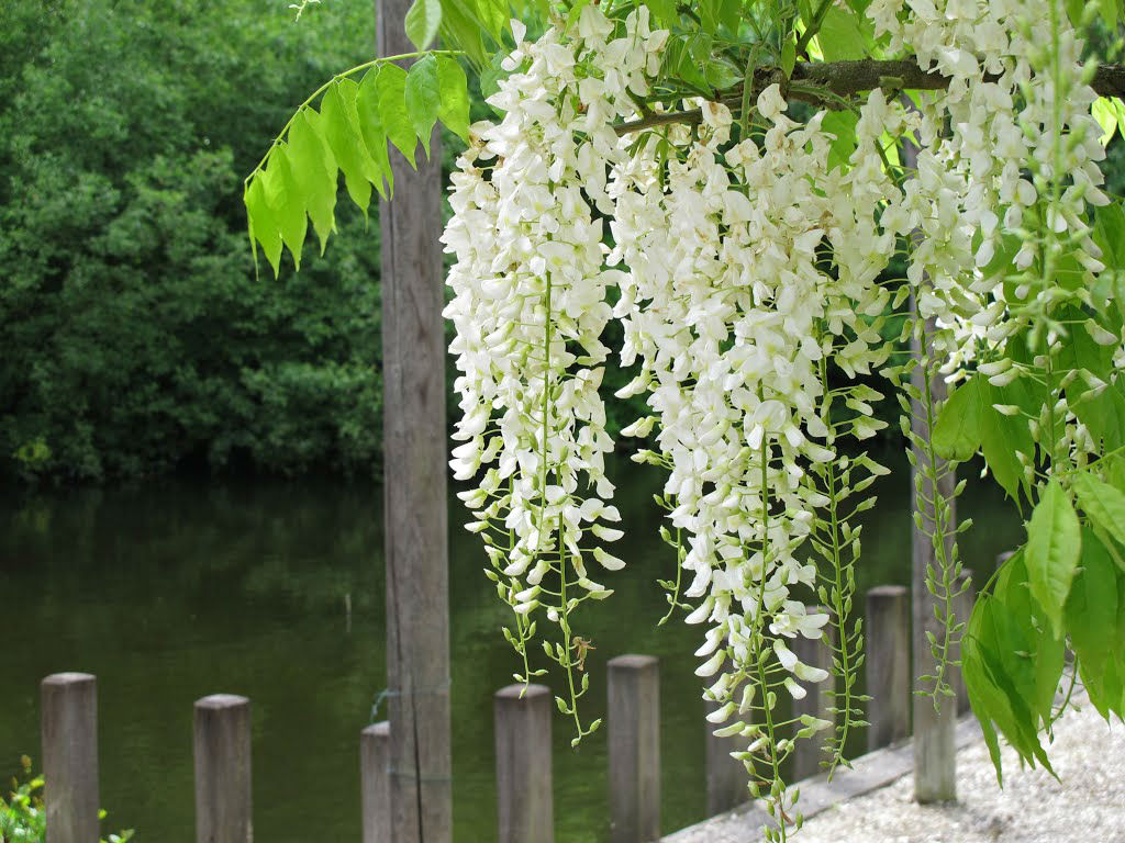 Глициния Альба - невероятной красоты лиана с крупными белыми свисающими соцветиями. Взрослое деревце ежегодно вырастает на 1-2 метра, в конечном результате достигая 6 метров. В мае на повислых ветвях распускаются белоснежные цветы, которые повторно появляются в конце августа.