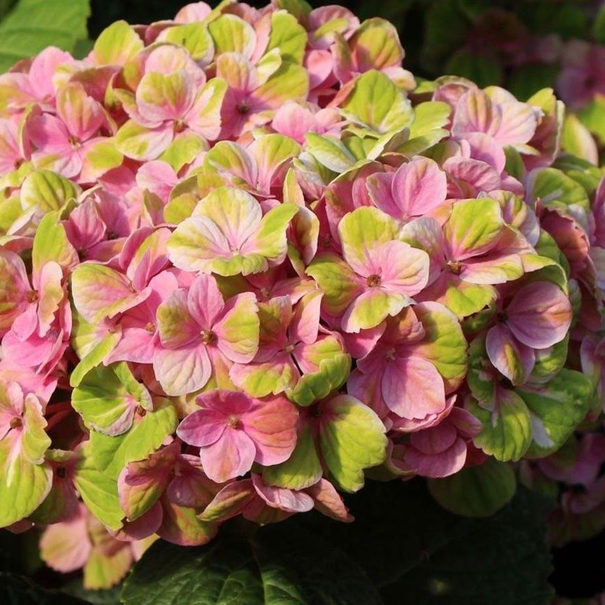 Гортензия крупнолистная Magical Coral - в течение всего периода цветения окраска цветков постоянно меняется. Вначале они бледно-зелёные, затем кораллово-розовые до розовых с фиолетовыми краями, потом цветки становятся зелёными с белыми краями. Цветки собраны в большие соцветия диаметром 20 см, которые отлично подходят для срезки. Куст высотой 100-120 см, шириной 100 см. Побеги толстые, крепкие. Листья тёмно-зелёные.