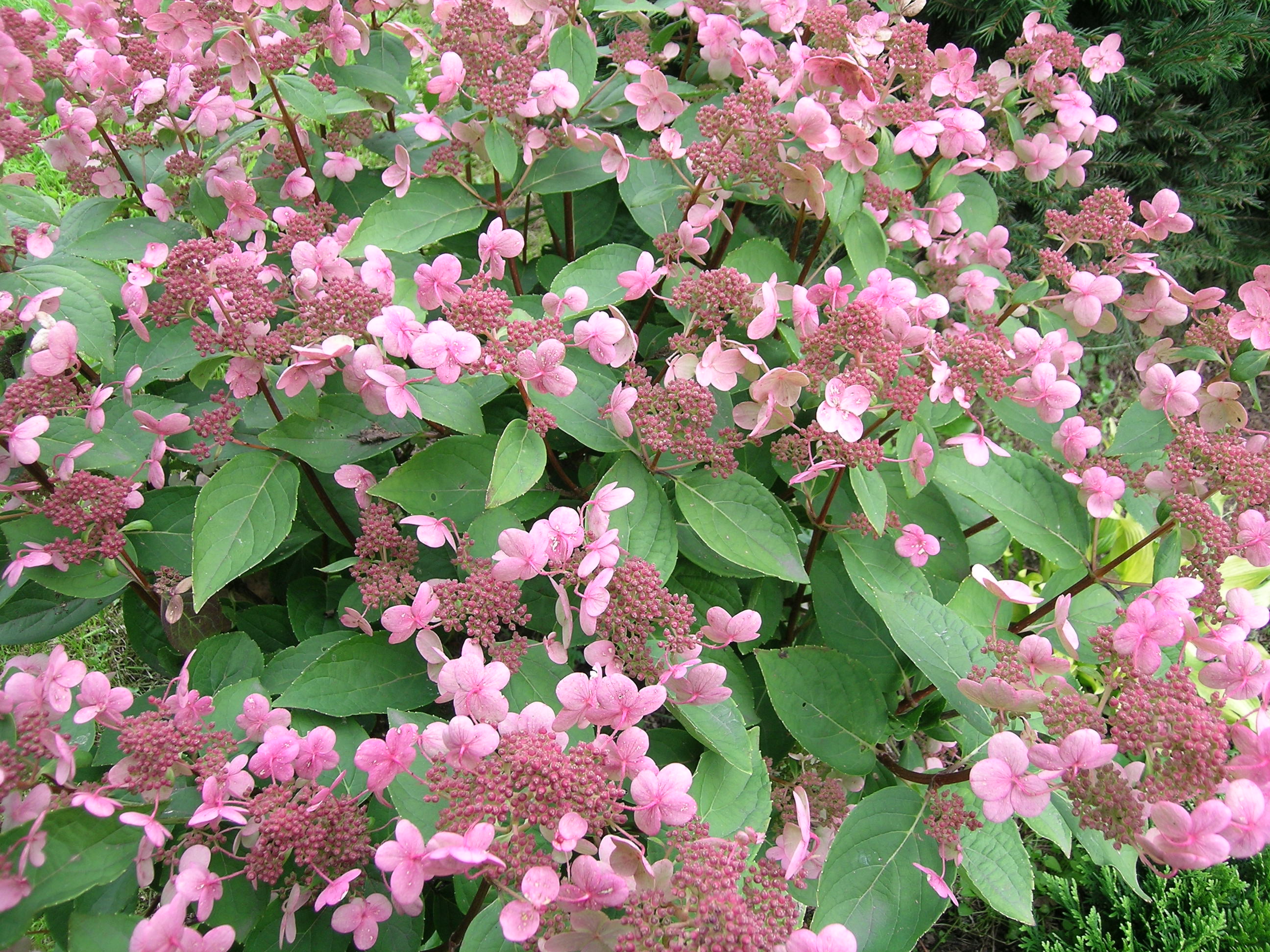 Гортензия метельчатая Dharuma – лиственный кустарник с веерообразной кроной до 1,5 метров в высоту. Листья продолговатые темно-красного оттенка, стебли также красноватые. Цветет метельчатыми соцветиями в форме конуса, цветки сначала светлые кремовые, позже становятся винно-красными и темно-розовыми. Высаживается только в нейтральные или слабокислые плодородные почвы, на солнечные места. Нельзя допускать застой влаги. Нуждается в регулярных подкормках. Зимой куст необходимо укрывать.