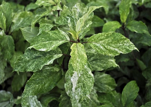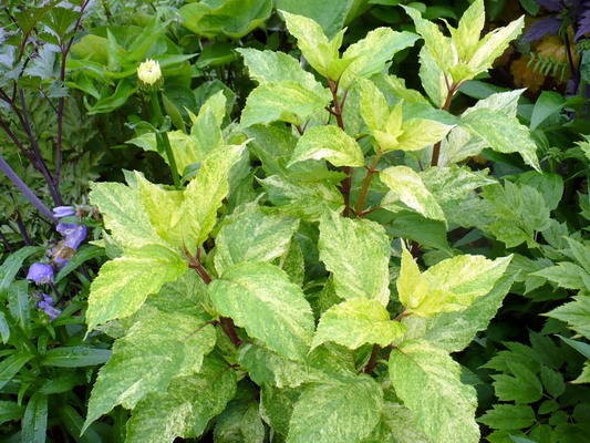 Сильный, жизнеустойчивый куст, с белыми метельчатыми соцветиями. Отличный сорт для любителей пестролистных растений. Листья здесь тёмно-зелёные с яркими кремовыми штрихами и мазками, расплывающимися по всей листовой