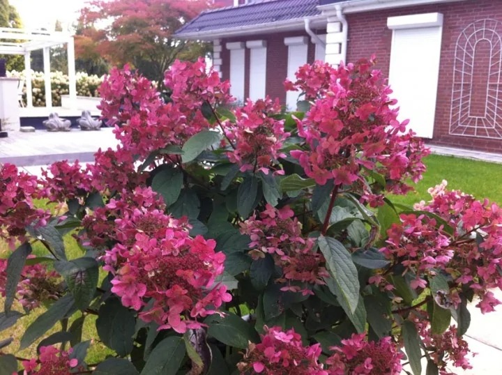 Гортензия метельчатая Вимс Ред на штамбе имеет хорошо развитой формы куст, с сильными, вертикальными ветвями. Её особенностью является трехступенчатая модель цветения, которое начинается необычно рано. Этот сорт необычно ранний и зацветает раньше всех других сортов гортензии метельчатой. Первые конусообразные цветы появляются уже в конце мая / начале июня , чисто белые, которые позже переходят к светло-розовым тонам. В сентябре букеты меняются на насыщенный темно-красный цвет. Сорт очень выносливый и неприхотливый. Все, что нужно этой гортензии –это солнечное место и воздействие света для достижения наиболее интенсивного изменения цвета, т.к. в тени такого результата сложно добиться. Высота 125-150 см, ширина 100-150 см.