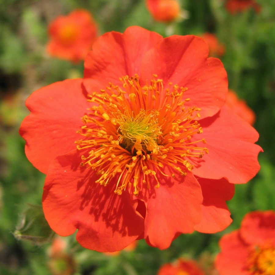 Гравилат гибридный Fireball - многолетнее травянистое растение. В высоту достигает 60-75 см. Цветки 4-5 см диаметром, полумахровые, оранжевые с шарлаховым оттенком.