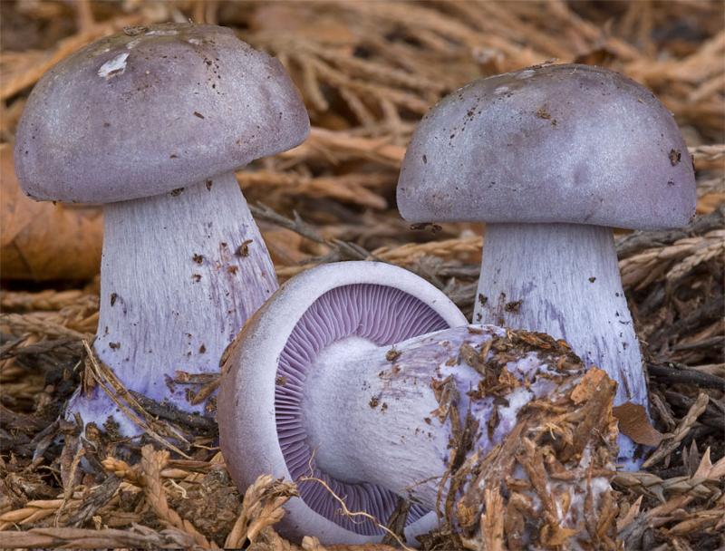 Гриб Рядовка фиолетовая - довольно крупный съедобный гриб 4 категории из семейства Рядовковых. Последние классификации относят его фиолетовую к роду говорушек. Форма шляпки молодой леписты также меняется с ее ростом: изначально полушаровидная с тонким загнутым краем, она становится распростертой и даже вдавленной у взрослого гриба, сохраняя загнутый вниз край. Диаметр шляпки зрелой рядовки может достигать от 6 до 10-15 см. Шляпка мясистая, плотно-упругая, сверху гладкая, влажная и блестящая, края неравномерны. Пластинки фиолетовой рядовки также меняют цвет в процессе взросления гриба от яркого фиолетового до бледно-лилового, почти серого. Ножка у этого гриба цилиндрической формы, высотой от 3 до 8 см с диаметром от 0,7 до 2 см, часто утолщена у основания.