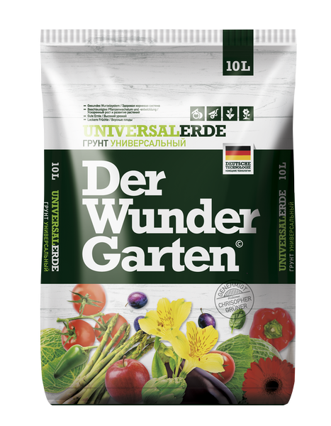 Грунт Универсальный (линия DER WUNDER GARTEN) 10 л - полностью готовый к применению питательный торфяной грунт Der Wunder Garten «Универсальный» для выращивания овощных и цветочных культур, комнатных растений, садовых цветов, плодовых деревьев и ягодных кустарников. В грунте содержится агроперлит, который повышает его воздухоёмкость, а также гидрореагент, который позволяет сократить количество поливов.