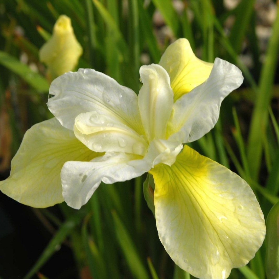 Ирис сибирский Батер энд Шугар (siberica Butter and Sugar) - высокорослый, обильноцветущий сорт с крупными бело-желтыми цветками. Описание Ирис siberica Butter and Sugar. Формирует куст до 80 см высотой и до 40 см шириной. Листья многочисленные, зеленые, узкие. Цветки крупные, до 12 см в диаметре, верхние лепестки белые, нижние лимонно-желтые. Может расти на солнце и в полутени. Плохо переносит застой воды, но обладает высокой засухоустойчивостью и зимостойкостью.