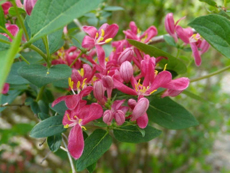 Жимолость Hack's Red - высокий, до 4 м высотой, густо облиственный кустарник с продолговатыми, темно-зелеными сверху и матовыми, сизоватыми снизу листьями до 6 см длиной. Цветки темно-пурпурные, душистые. Плоды желтые или красные до 0,7 см в диаметре. Цветет и плодоносит обильно и ежегодно с трех-четырех лет. Продолжительность цветения иногда достигает почти месяца. Сорт переносит затенение, засоление, морозостойкий, засухоустойчивый, к почве и влажности нетребовательный. Растет довольно быстро.