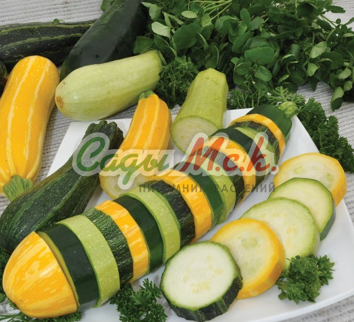 Раннеспелая урожайная смесь сортов кабачков. Растения различного типа. Плоды овальной или овально-вытянутой формы оранжевого, желтого, зеленого цвета или с рисунком. Средняя масса плодов 0,8-1,0 кг. Мякоть толстая, сочная, желтого или оранжевого цвета, с приятным вкусом и ароматом. Выращивают прямым посевом в открытый грунт в конце мая — начале июня на глубину 5-6 см по схеме 70х100 см. Плоды употребляют в вареном, тушеном и жареном виде, а также свежими (молодые завязи) в салатах. Из них получается аппетитное консервированное ассорти. Зрелые крупные плоды хранятся до 4 месяцев.